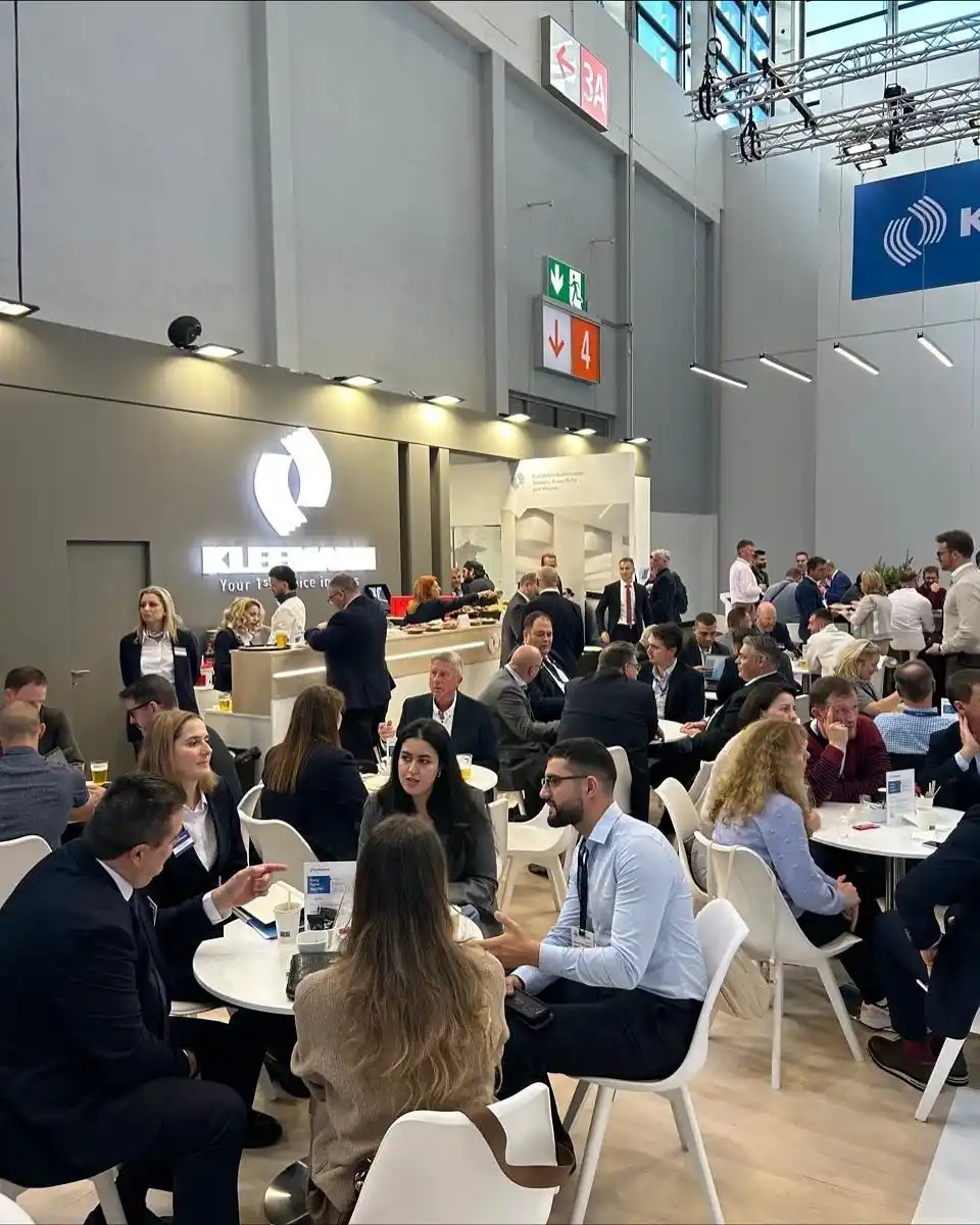 At the center of the space, a large overhead structure carried the KLEEMANN branding and ensured the booth was clearly visible across the exhibition hall. The open island layout allowed visitors to approach from all sides and naturally flow through different demonstration areas.