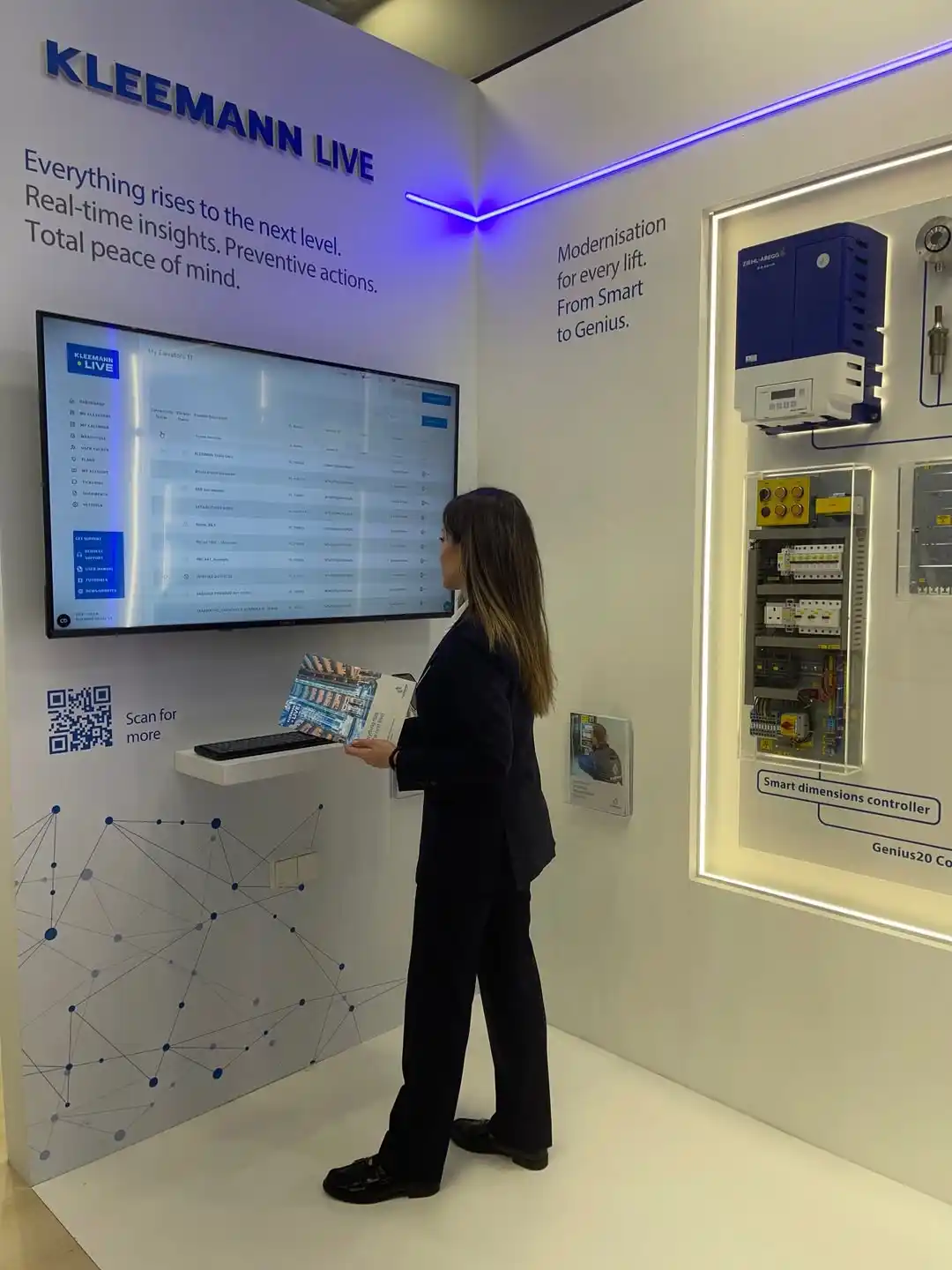 One of the key attractions was the Digital Spot experience zone, where visitors could interact with touchscreens, explore elevator control systems, and learn about KLEEMANN’s smart technologies.